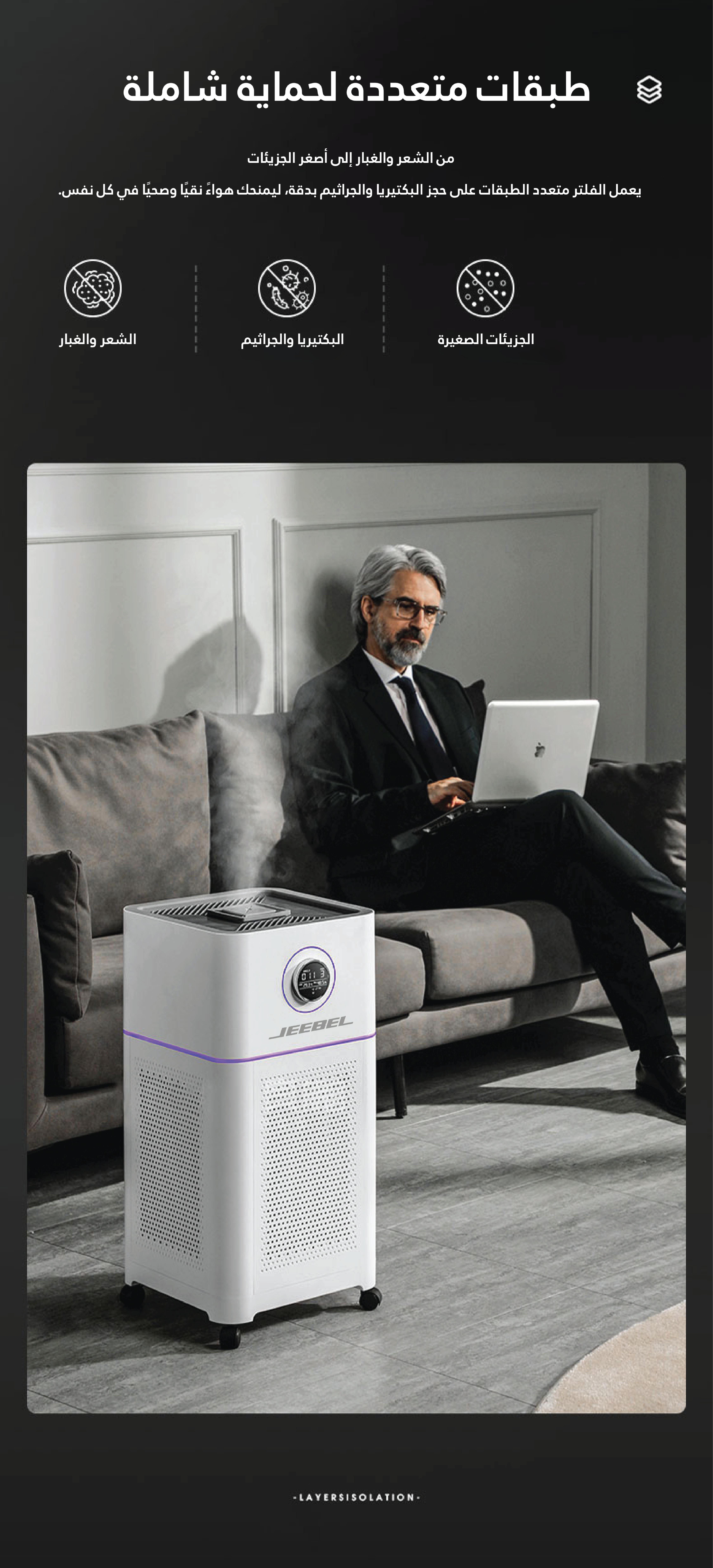 جيبل - جهاز تنقية وترطيب وتعقيم الهواء الذكي Jeebel – فلتر هيبا متعدد الطبقات مع UV وكربون نشط وتحكم عبر التطبيق و 4 سرعات