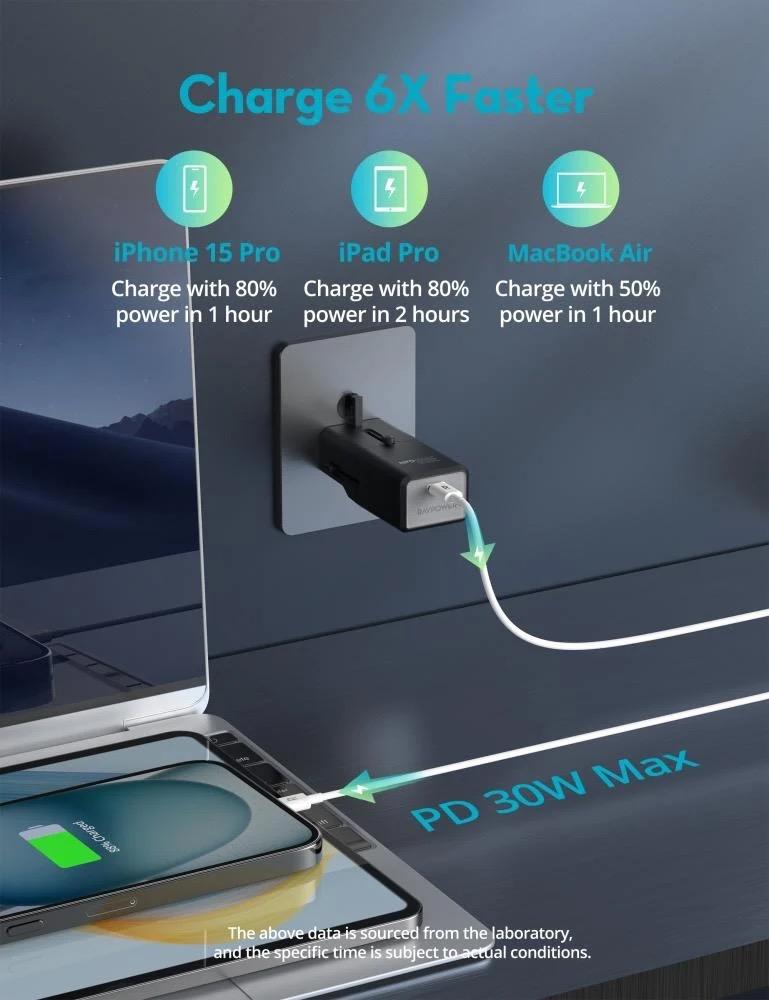 - يقدم شحنًا أسرع بمعدل 6 مرات لجهاز iPhone 15 Pro، وiPad Pro، وMacBook Air.