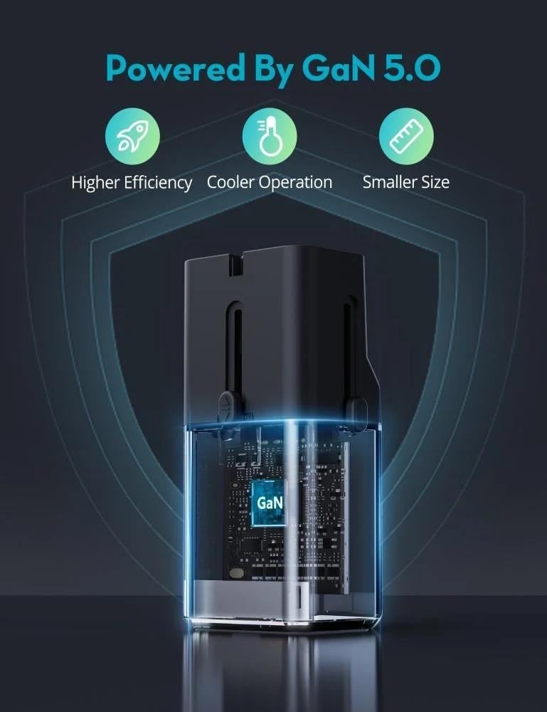 - يعتمد على تقنية GaN 5.0، مما يوفر كفاءة أعلى، ويعمل بشكل أكثر برودة، ويتميز بحجم أصغر.