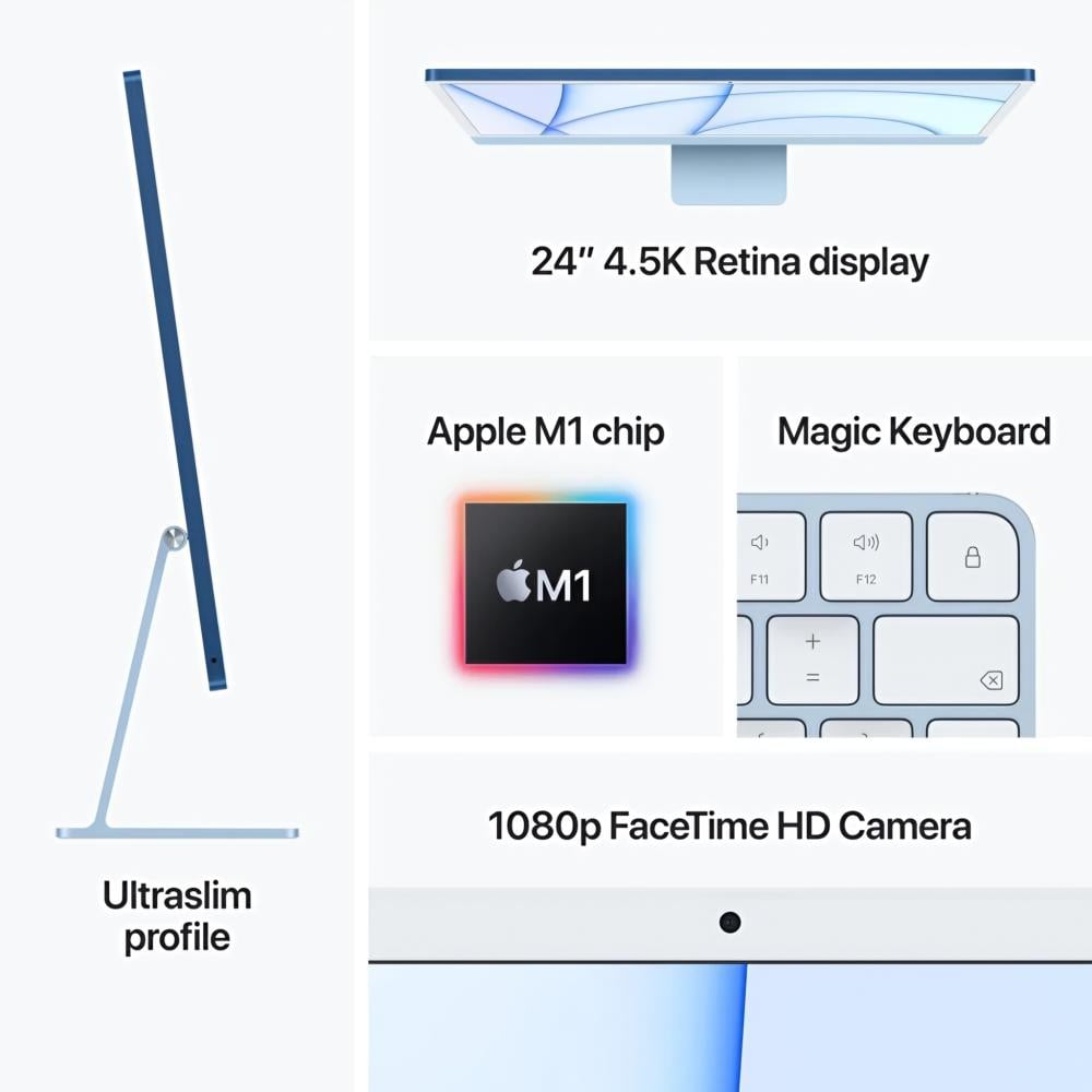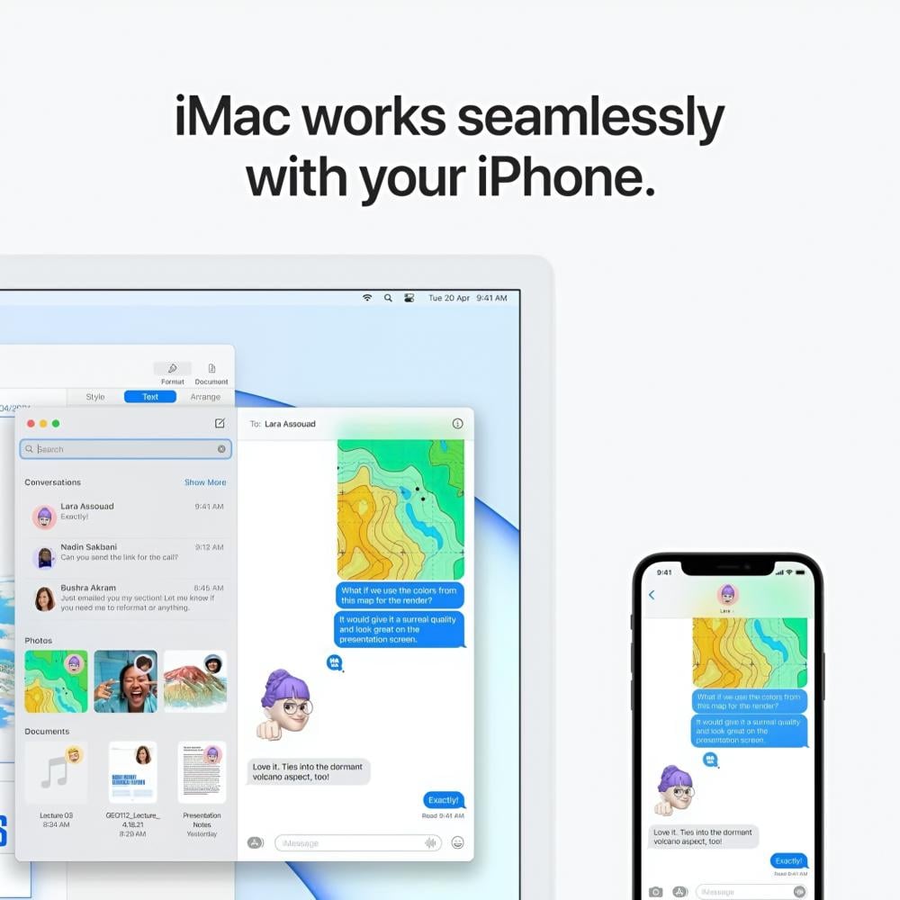 التكامل مع أجهزة Apple الأخرى سلس وطبيعي، حيث يمكن نسخ المحتوى من iPhone ولصقه على iMac أو استخدام iMac للرد على مكالمات FaceTime أو إرسال الرسائل. يأتي الجهاز مزودًا بلوحة مفاتيح وفأرة Magic Keyboard وMagic Mouse بلون متناسق مع الجهاز، بالإضافة إلى كابل USB-C إلى Lightning.