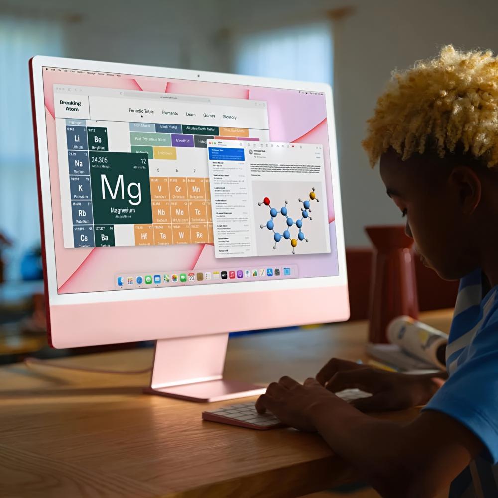الكاميرا الأمامية بدقة 1080p مزودة بثلاثة ميكروفونات بجودة استوديو ونظام صوتي مكوّن من ست سماعات مع دعم للصوت المحيطي، ما يوفّر تجربة مرئية وصوتية متكاملة أثناء الاجتماعات والمكالمات. يدعم iMac تشغيل تطبيقاتك المفضلة مثل Microsoft 365 وAdobe Creative Cloud وZoom، كما يتيح تشغيل العديد من تطبيقات iPhone وiPad مباشرة على الجهاز.