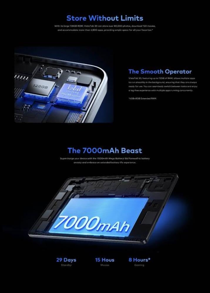 - البطارية: بطارية سعة 7000 مللي أمبير توفر وقت استخدام طويل يصل إلى ساعات متواصلة.